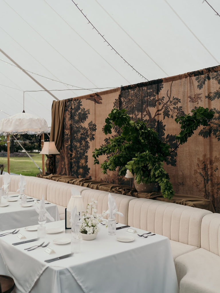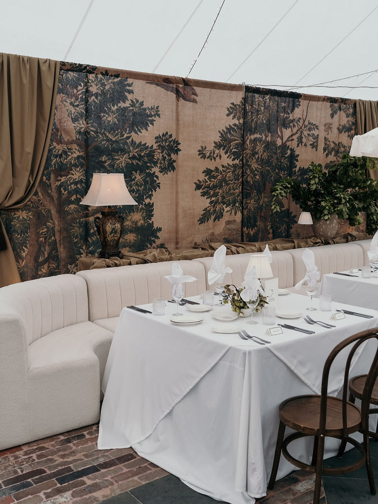Introducing our new HIRE range. The range currently consists of 2 huge 3m x 3m Golden Tapestry panels and 60cm Vaucluse ruffle ivory linen lighting and I will add more over time.