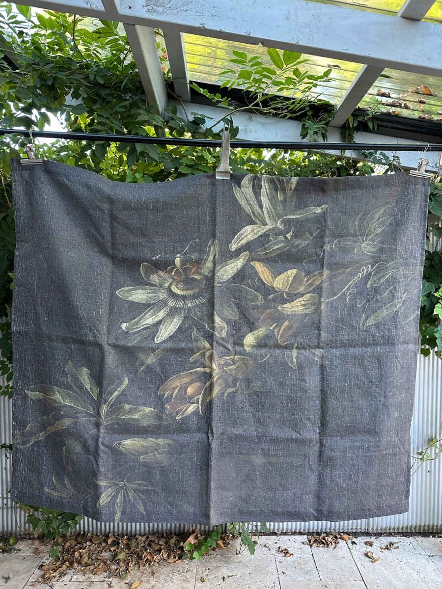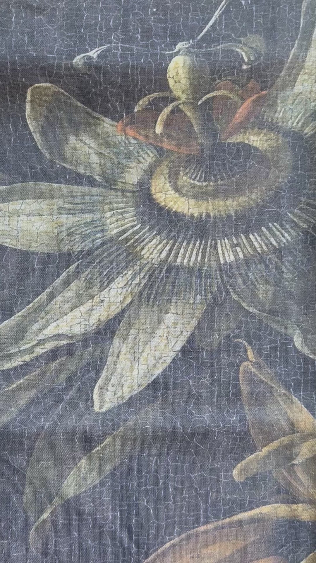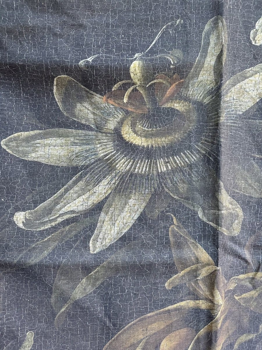 17th century vintage Dutch oil painting of passion flowers against a dark moody background, printed on 100% OATMEAL linen.